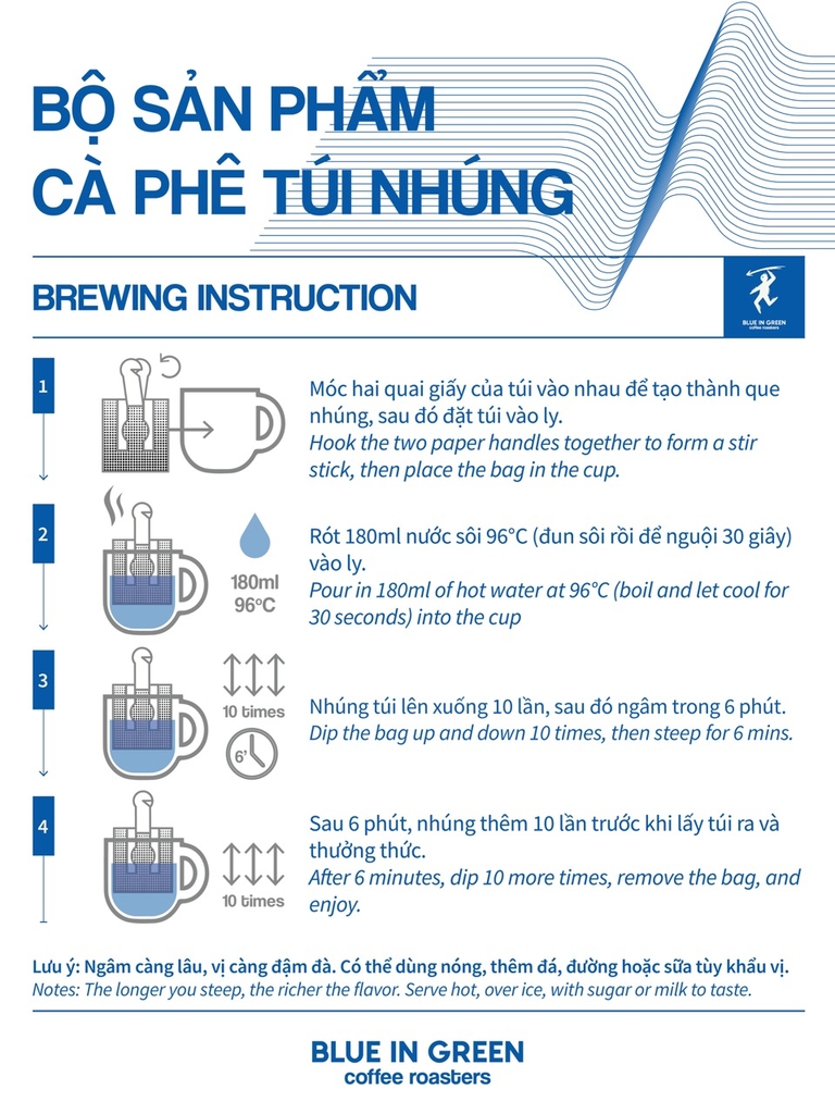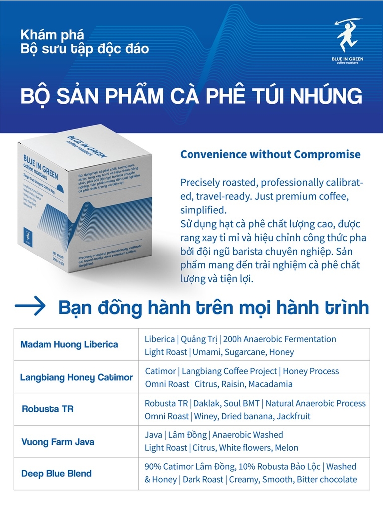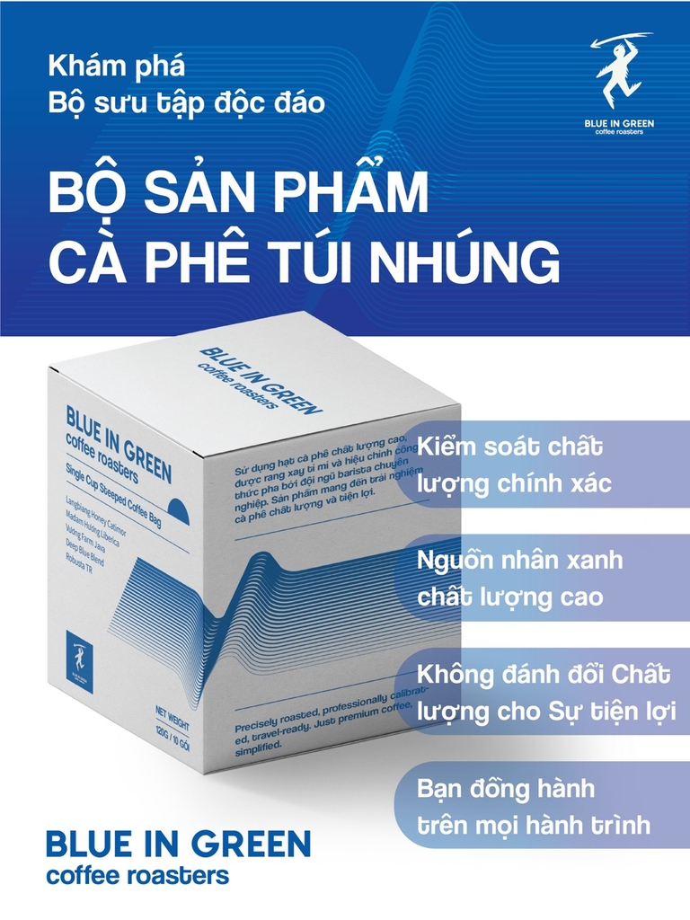 Thành lập từ năm 2018, các thợ rang của chúng tôi không ngừng nâng cao tay nghề và hoàn thiện các hồ sơ rang, mang đến các sản phẩm và giải pháp thưởng thức cà phê cao cấp. Giờ đây, chúng tôi tự hào mang những kiến thức và tay nghề đó vào định dạng sản phẩm tiện lợi này. Mỗi túi cà phê nhỏ đều mang chất lượng và sự tỉ mỉ đã định hình nên thương hiệu Blue in Green.